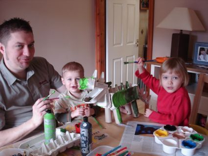 Today we all felt creative so out came the egg boxes, glue and paint and much mess ensued. The aim was to create our very own dinasour as Miles is very jealous of the one little George pig has on TV !